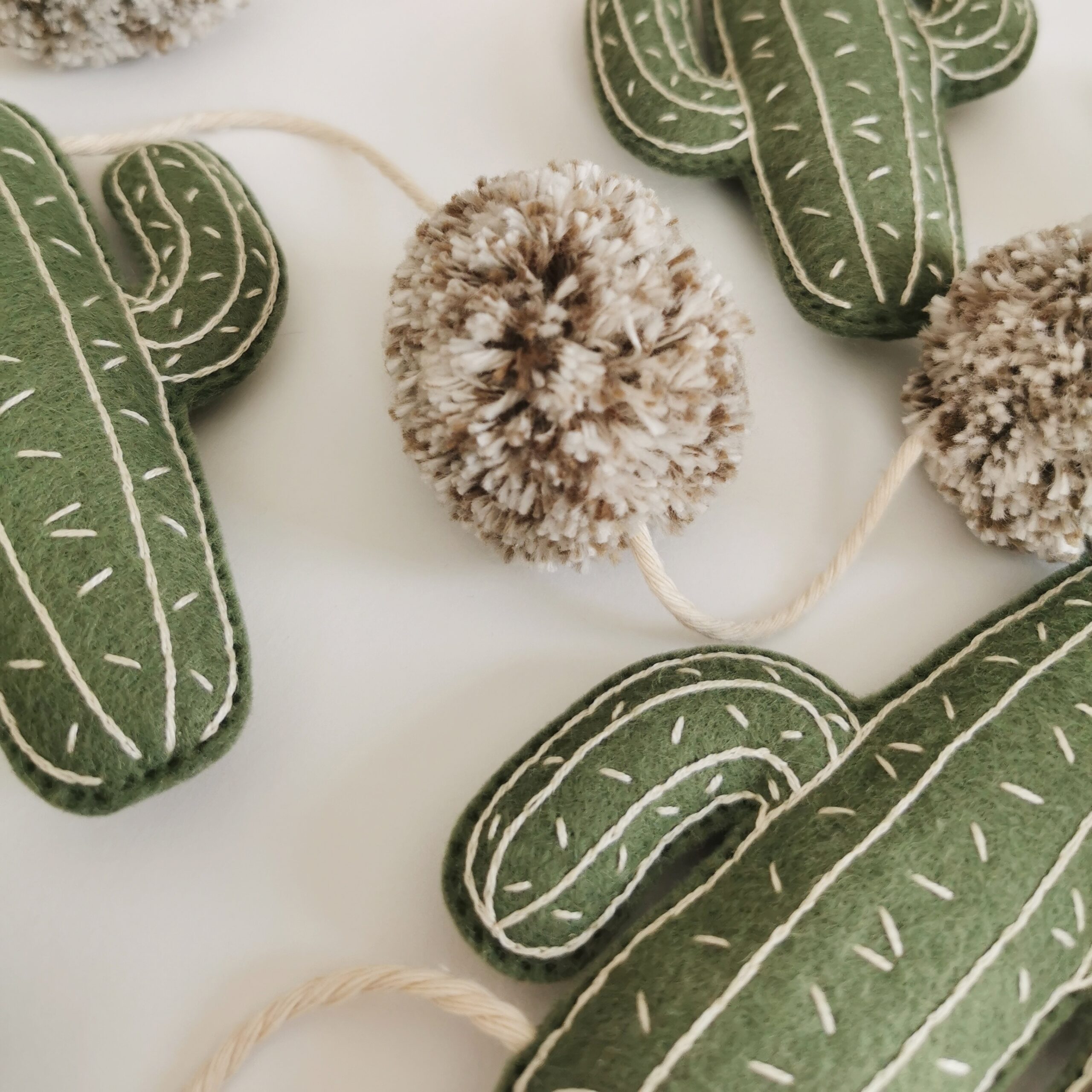 - Cactus en feutrine verte : Trois cactus minutieusement brodés à la main, apportant une touche artisanale et chaleureuse à votre décoration.