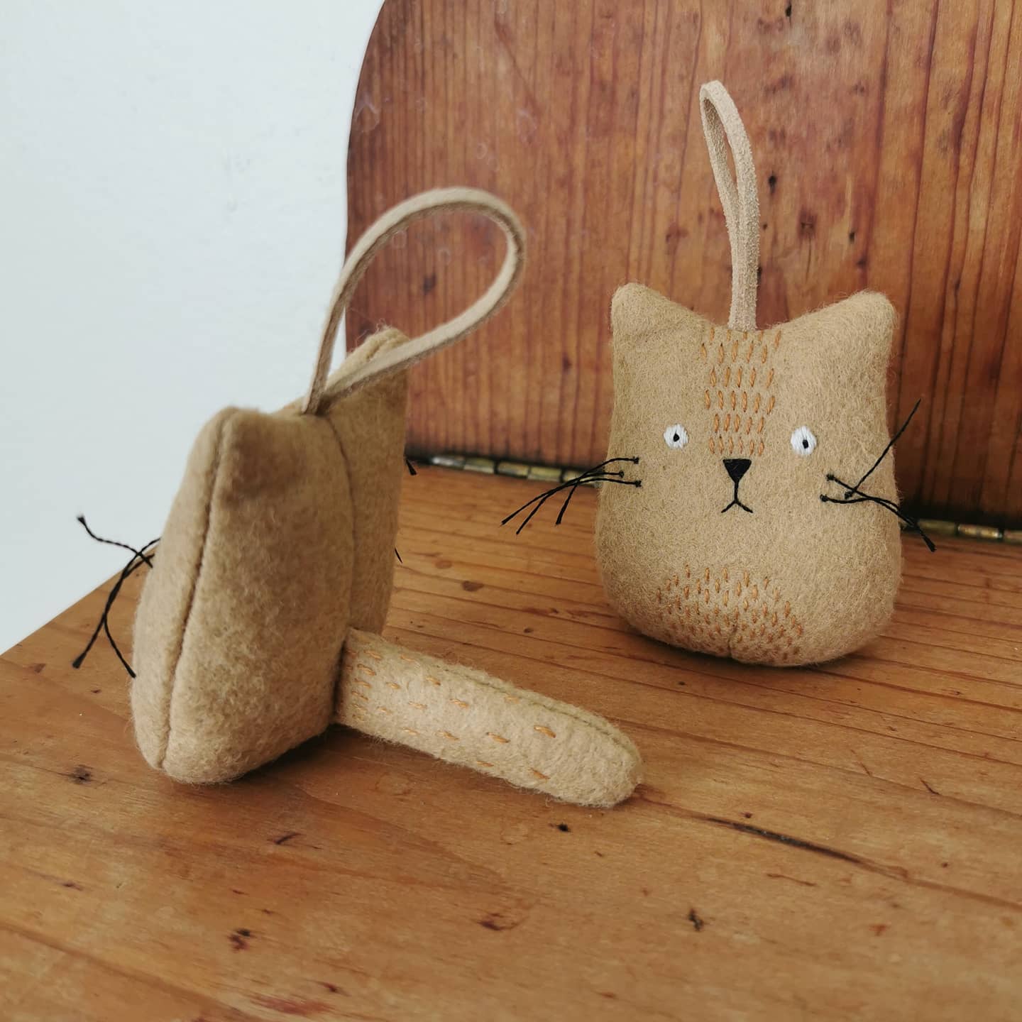 • Chat brodé en feutrine beige : Un chat en feutrine minutieusement brodé à la main.