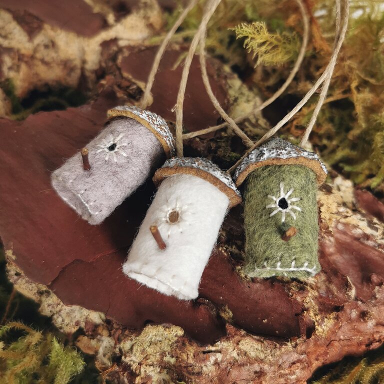 - Nichoirs en feutrine avec capuchon de graine d’eucalyptus : Un nichoir minutieusement brodé, cousu et assemblé à la main. Orné d’un capuchons en graine d’eucalyptus, ajoutant une touche naturelle à votre décoration.