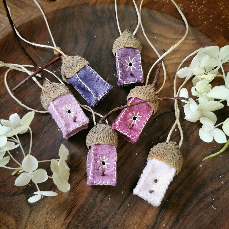 - Nichoirs en feutrine avec capuchon de gland de chêne : Un nichoir minutieusement brodé, cousu et assemblé à la main. Orné d’un capuchons de glands de chêne (cueillis à la main par mes soins de manière responsable et raisonnée vis-à-vis de l’environnement), ajoutant une touche naturelle à votre décoration.